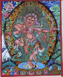 作明佛母,又称咕噜咕列佛母,为佛教密宗掌管权威及怀法的本尊,亦被认为是二十一度母之红色度母化现,藏传力量女神。四手三眼,身红色,金发怒冲,手持莲花钩斧,搭箭拉弓,作射箭姿,腰系虎皮裙,颈挂人头,头戴骷髅冠,身佩珠宝璎珞。足下踩一魔,若身居火中,具大权威势。