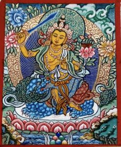文殊菩萨,又称文殊师利童真、孺童文殊菩萨。为佛教四大菩萨之一。与般若经典关系甚深,故称为大智文殊师利菩萨。
