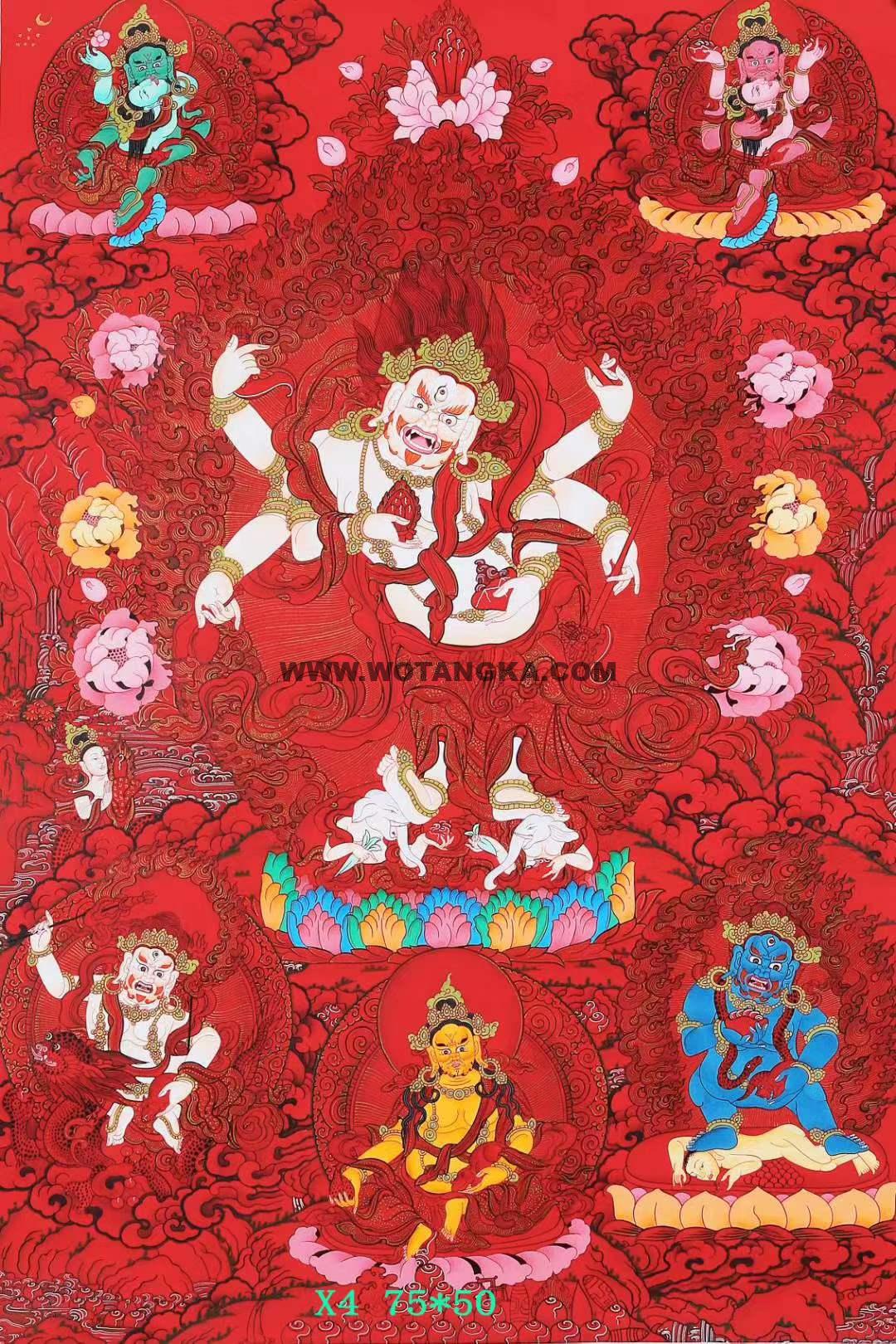 尼泊尔精品红唐白六臂玛哈嘎拉手绘布本、佛教艺术与传统美学的完美结合!主尊宝相传神,画工细腻,采用天然矿物质、宝石磨粉、真金勾线、期待有缘人。