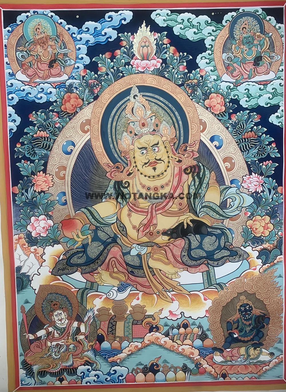 黄财神为北方司财众部之首领,掌无尽宝库,修此法者,可消灭六道穷苦,增长福德、寿命、智慧, 以及一切物质与精神上的受用。心灵上得到满足。黄财神是藏传佛教各大教派普遍供养的五姓财神之一,因其身相黄色,故称黄财神。修持黄财神法、持诵其密咒,可获得黄财神庇佑,能增长福德、寿命、智能、物质及精上之受用,不被生活所逼,以及一切经济压迫,可安心向道。但修法者需发无上菩提心,广结善缘,勤行布施。万勿悭贪成性,护法降罪也. 黄财神面慈目善,头戴宝冠,坦胸露腹,戴着珍宝璎珞、珍宝耳环、珍宝手镯和珍宝足钏,上身穿丝制天衣,下身着丝制裙子,右手于右膝上捧喷焰末尼,左手握着吐宝鼬,以威镇坐姿坐在莲花宝座中央。身后有光环、祥云、远山。能增长福德、寿命、智慧、物质及精神上之受用。主司财富,能使一切众生脱于贫困,财源广进。