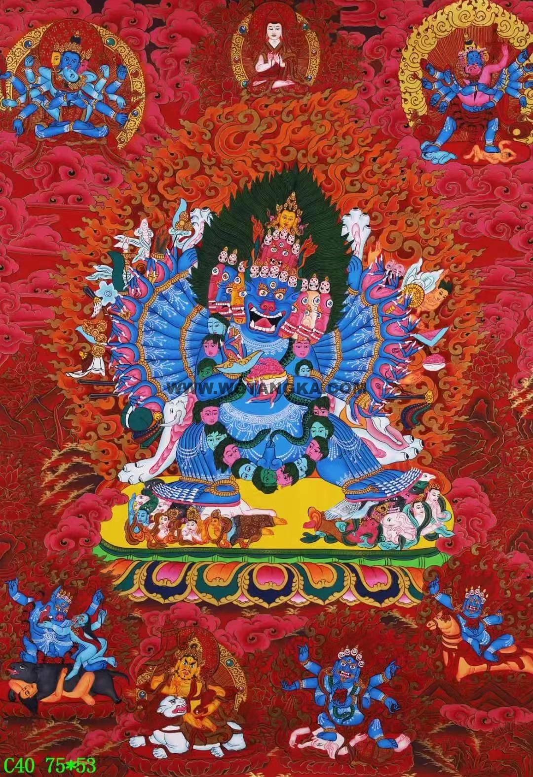 尼泊尔知名唐卡画师手绘力作精品【大威德金刚】 唐卡手绘布本,作品采用采用24K金描线,金粉混合天然颜料纯手绘而成,画工细腻,开脸殊胜,能量极强,严格的遵照佛经的度量仪轨如法绘制,期待有缘人。