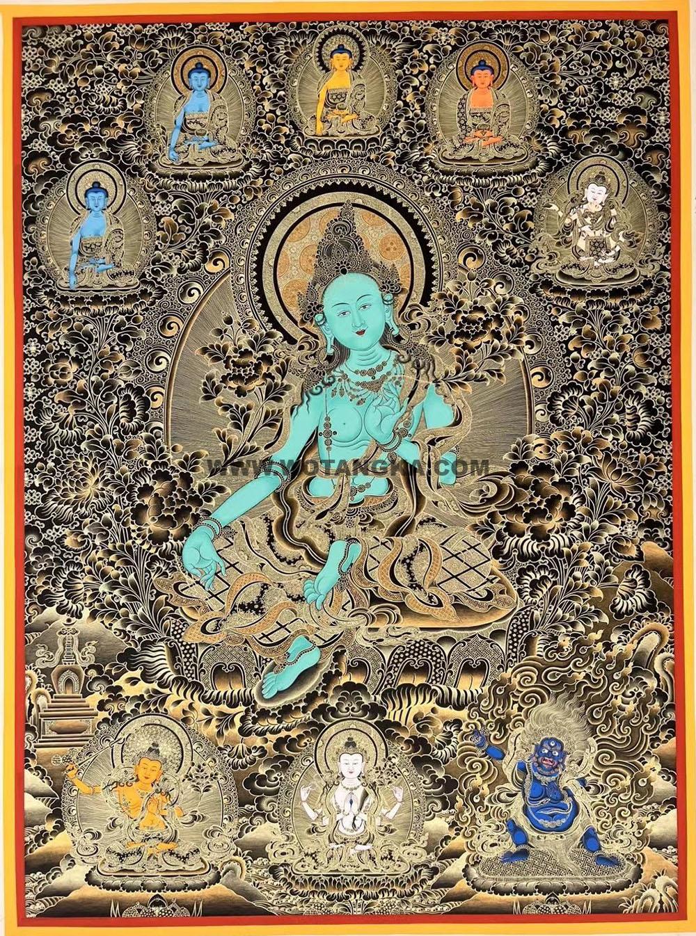 中国唐卡艺术作品中的【绿度母】唐卡手绘布本,热贡知名画师巴桑·画院出品,收藏供奉不要错过。作品主尊宝相传神, 采用天然矿石晕染,纯金描线,画工细腻,殊胜,精美、风格富丽,采用24K真金描绘,画工细腻,开脸殊胜,是一副难得一见的好唐卡作品。