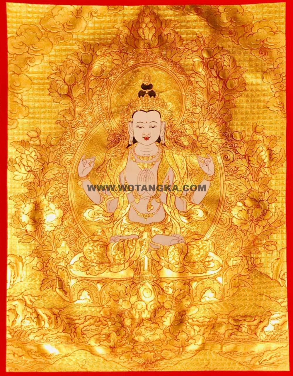 中国唐卡艺术作品中的【四臂观音】唐卡手绘布本,热贡知名画师巴桑·画院出品,收藏供奉不要错过。作品主尊宝相传神, 采用天然矿石晕染,纯金描线,画工细腻,殊胜,精美、风格富丽,采用24K真金描绘,画工细腻,开脸殊胜,是一副难得一见的好唐卡作品。
