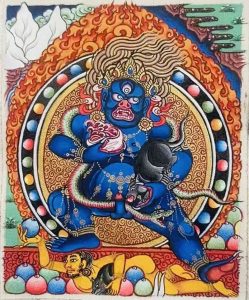 黑财神乃是五方佛之东方金刚不动佛,为利益娑婆众生摆脱穷困的苦恼所做的化现。 身青黑色,故名。主要功德为驱除所有违缘的纠缠,并使一切善愿都能心想事成,圆满无碍。 此尊身形矮胖,大肚福相,红发黑肤裸体,三目圆睁,发须眉赤红如火,头戴宝冠,以珠宝璎珞、以八龙王为饰,生殖器上竖,辉光靠背,粗体大腹,右手擎盈血颅器于胸,左手捉吐宝鼠,两足以右曲左伸姿威立, 踏于黄色持财天之背,安住莲花月轮座上。