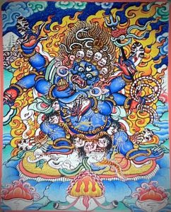 玛哈嘎拉是梵语,译为大黑天,即”怙主”之意,为上师、本尊、护法三根本之护法神,是佛教三根本的化身。其为调伏刚强众生而呈现忿怒相,本尊及眷属护法众除护持佛法外,依缘起多示现为两臂、四臂、六臂黑、白等形象,为藏传佛教诸宗共同推崇的智慧护法,是藏传佛教中最重要的护法神之一。