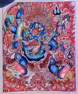 玛哈嘎拉是梵语,译为大黑天,即”怙主”之意,为上师、本尊、护法三根本之护法神,是佛教三根本的化身。其为调伏刚强众生而呈现忿怒相,本尊及眷属护法众除护持佛法外,依缘起多示现为两臂、四臂、六臂黑、白等形象,为藏传佛教诸宗共同推崇的智慧护法,是藏传佛教中最重要的护法神之一。