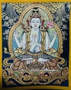 四臂观音本尊身颜洁白如月,头戴五佛冠,发黑色结髻,中央二手合掌於胸前,捧有摩尼宝珠,右手持水晶念珠。左手拈八瓣莲花与耳际齐,面貌寂静含笑。以菩萨慧眼凝视众生,凡被其观者尽得解脱。全身花蔓庄严,双跏趺坐於莲花月轮上,身发极大五彩光,明朗照耀。
