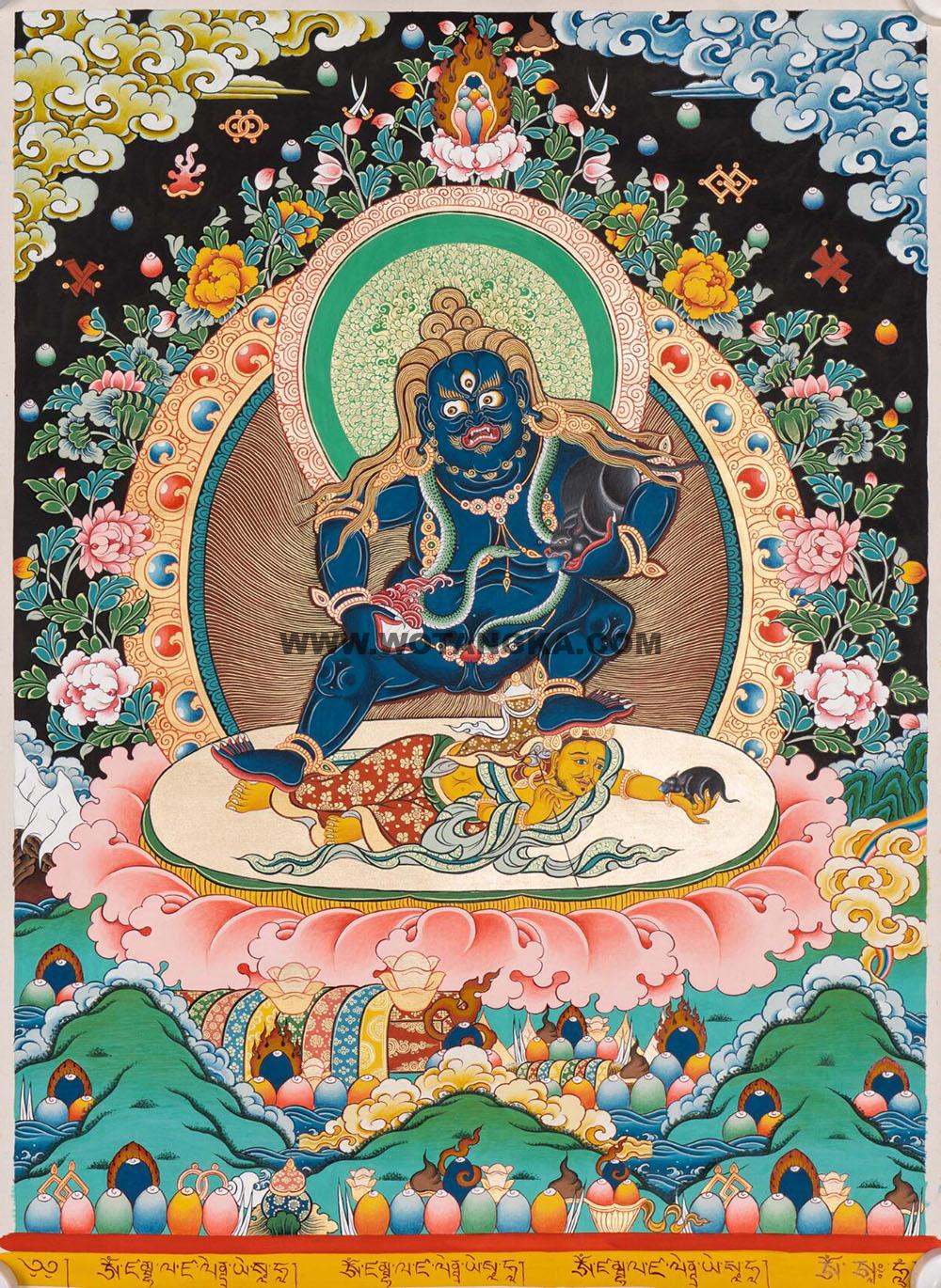 黑财神藏名“藏拉那波”,乃是东方佛里的金刚不动佛。为了利益娑婆众生解脱穷困之苦而化现,在密宗认为,黑财神是五姓财神中施财立即见效的财神,甚至称他为财神王。黑财神乃是五方佛之东方金刚不动佛,为利益娑婆众生摆脱穷困的苦恼所做的化现。 身青黑色,故名。主要功德为驱除所有违缘的纠缠,并使一切善愿都能心想事成,圆满无碍。 此尊身形矮胖,大肚福相,红发黑肤裸体,三目圆睁,发须眉赤红如火,头戴宝冠,以珠宝璎珞、以八龙王为饰,生殖器上竖,辉光靠背,粗体大腹,右手擎盈血颅器于胸,左手捉吐宝鼠,两足以右曲左伸姿威立, 踏于黄色持财天之背,安住莲花月轮座上。修持黑财神法门,可获其庇佑,消除怨敌、偷盗、病魔等障,使诸受用财富增长。