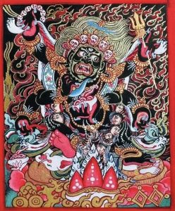 玛哈嘎拉是梵语,译为大黑天,即”怙主”之意,为上师、本尊、护法三根本之护法神,是佛教三根本的化身。其为调伏刚强众生而呈现忿怒相,本尊及眷属护法众除护持佛法外,依缘起多示现为两臂、四臂、六臂黑、白等形象,为藏传佛教诸宗共同推崇的智慧护法,是藏传佛教中最重要的护法神之一。