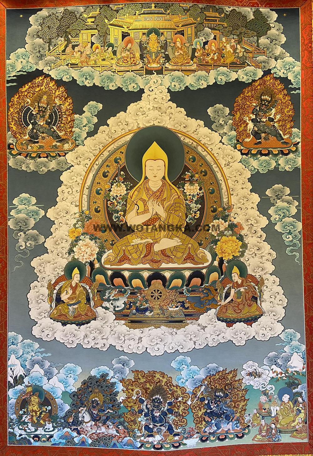 唐卡作品名称:宗喀巴大师师徒三尊文殊法界化现格鲁派护法尊吉祥供养图