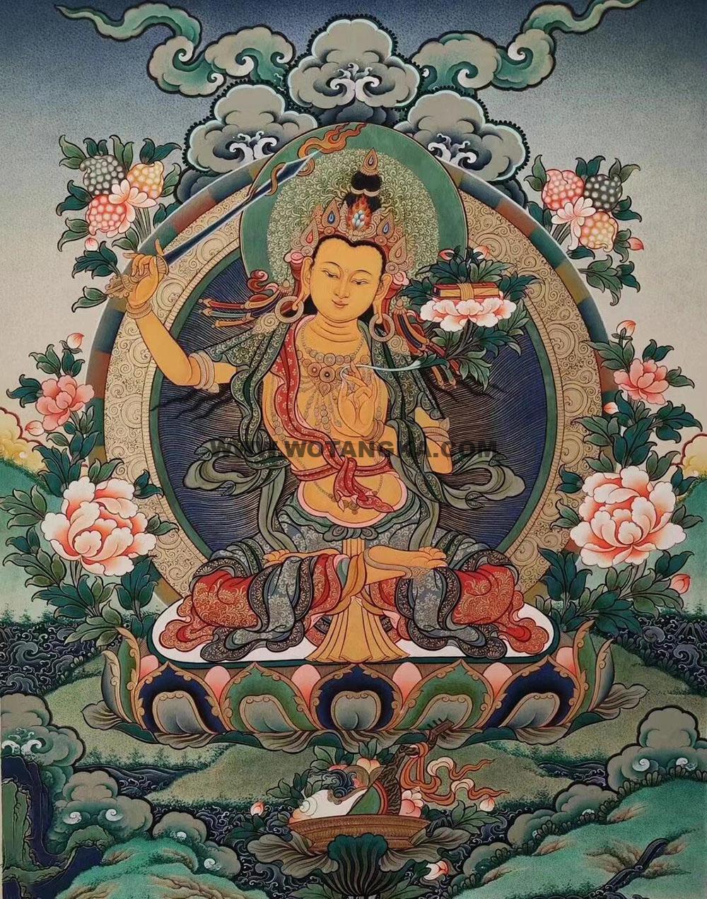 中国唐卡艺术作品中的【文殊菩萨】唐卡手绘布本,热贡知名画师索南多杰·画院出品,收藏供奉不要错过。作品主尊宝相传神, 采用天然矿石晕染,纯金描线,画工细腻,殊胜,精美、风格富丽,采用24K真金描绘,画工细腻,开脸殊胜,是一副难得一见的好唐卡作品。