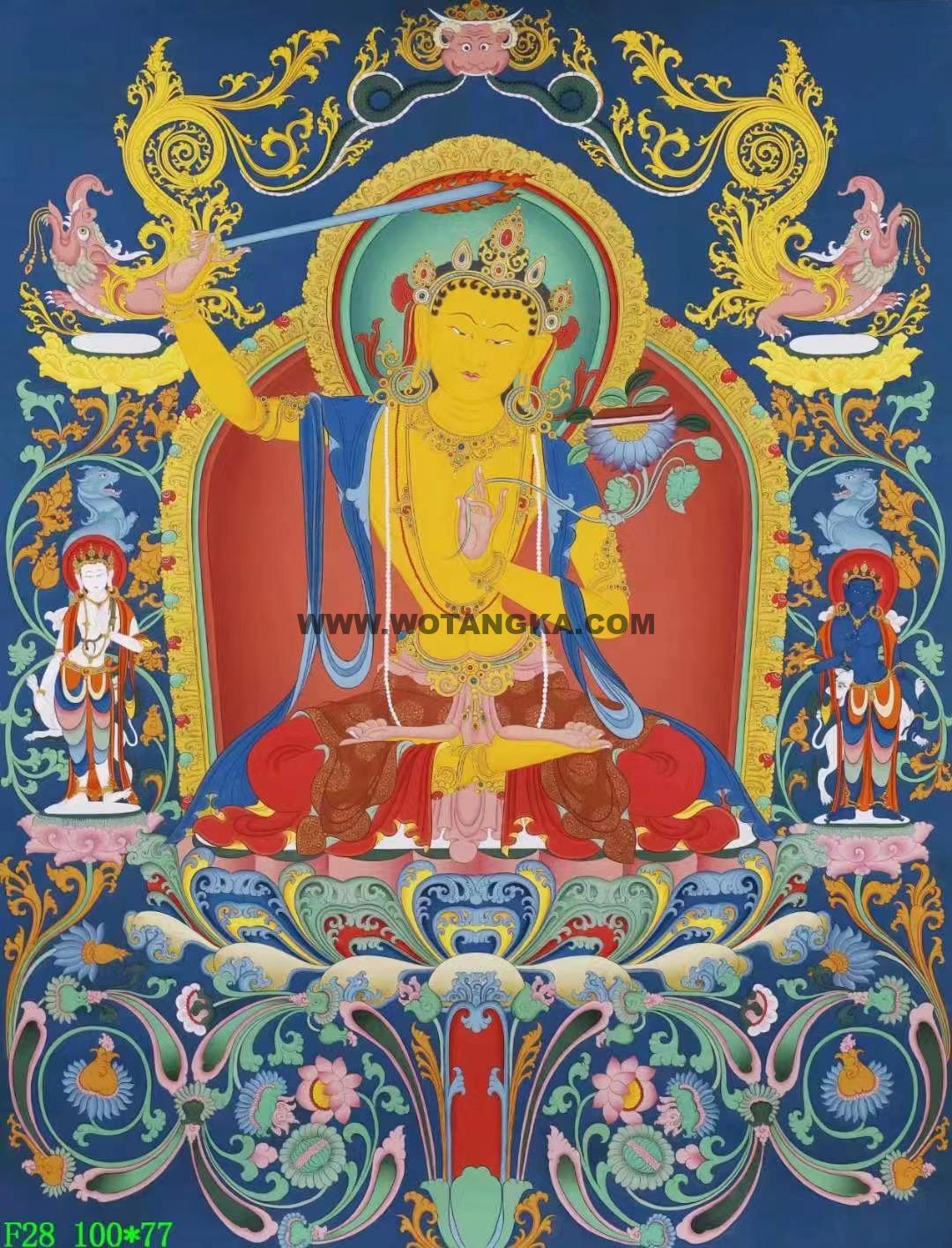 中国唐卡艺术作品中的【文殊菩萨】唐卡手绘布本,西藏成名画师出品,收藏供奉不要错过。作品主尊宝相传神, 采用天然矿石晕染,纯金描线,画工细腻,殊胜,精美、风格富丽,采用24K真金描绘,画工细腻,开脸殊胜,是一副难得一见的好唐卡作品。