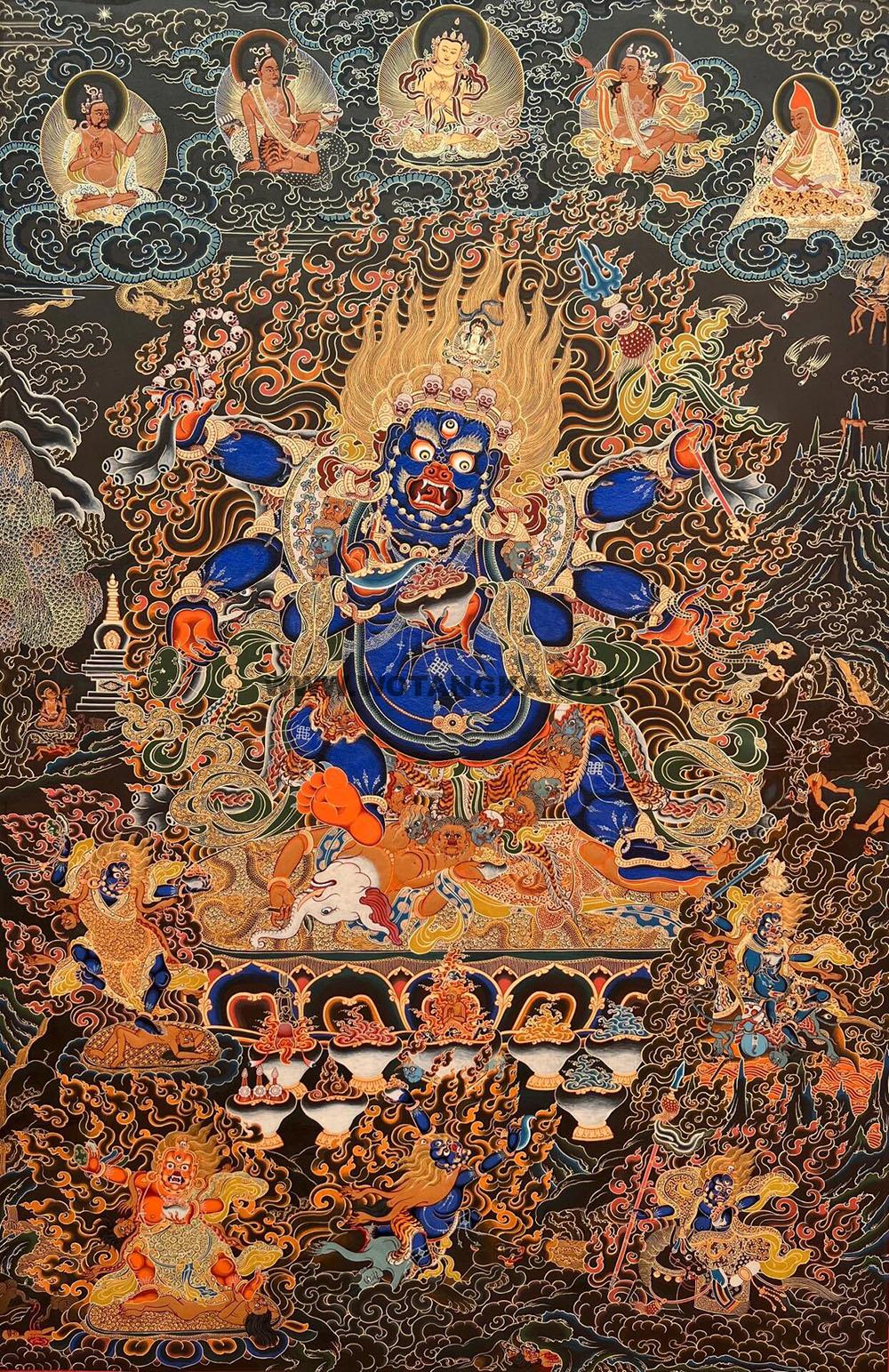 唐卡作品名称:六臂玛哈嘎拉五伴神殊胜本尊天界上师吉祥供养图