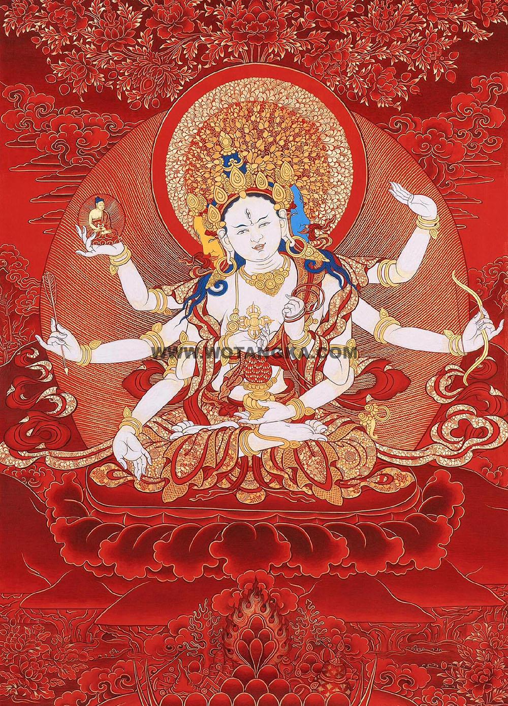 尊胜佛母的藏文名为Namgyalma,他有九种化相,其最主要的化相,亦即其三面八臂、极为常见之形相。顶髻尊胜佛母的身体为白色,三头八臂,中间的脸为白色,右面的脸为黄色,左面的脸为蓝色,面相微怒,虎牙略露,每一个脸上都有三只眼睛,右第一手持四色羯磨杵(十字金刚) 于胸前,二手托莲座,上为阿弥陀佛,三手持箭,四手施愿印置右腿前,左第一手忿怒拳印持绢索,二手上扬作施无畏印,三手执弓,四手定印托甘露宝瓶。佛母威严慈祥,项戴珍宝璎珞,身着秀丽天衣,双足跏趺于莲花宝座中央。