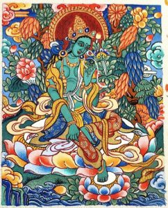 绿度母坐菩萨座于莲花月轮上,双脚屈左展右,左腿单坐,右腿向下舒展,踏在莲花上表示随时准备起身救度苦难众生,如慈爱的母亲一般,拯救钟爱的孩子;