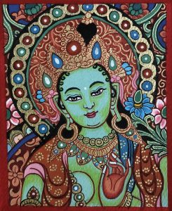 绿度母坐菩萨座于莲花月轮上,双脚屈左展右,左腿单坐,右腿向下舒展,踏在莲花上表示随时准备起身救度苦难众生,如慈爱的母亲一般,拯救钟爱的孩子;