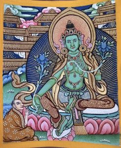 绿度母坐菩萨座于莲花月轮上,双脚屈左展右,左腿单坐,右腿向下舒展,踏在莲花上表示随时准备起身救度苦难众生,如慈爱的母亲一般,拯救钟爱的孩子;