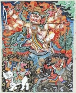 白哈尔意之王,又称意明王护法,本名帝释。他位处中央,是主神,有时也有白哈尔本身居中的形式。他一身蓝黑色,一面二手,呲牙咧嘴,右手持绳套,左手执利刃,身着熊皮外套和黑丝披风,头戴黑丝头饰,骑一头长鼻白象。他的前面有门普布查牵象和大夜叉命主杨来白骑马导引。他的明妃叫响帝若散玛。