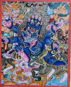 玛哈嘎拉是梵语,译为大黑天,即”怙主”之意,为上师、本尊、护法三根本之护法神,是佛教三根本的化身。其为调伏刚强众生而呈现忿怒相,本尊及眷属护法众除护持佛法外,依缘起多示现为两臂、四臂、六臂黑、白等形象,为藏传佛教诸宗共同推崇的智慧护法,是藏传佛教中最重要的护法神之一。