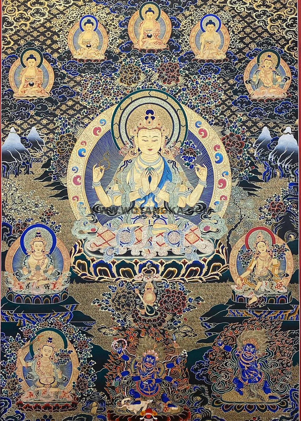 编号188-668964:黑金唐卡-四臂观音·三怙主(120*90CM左右) | 沃唐卡www.WoTangKa.com
