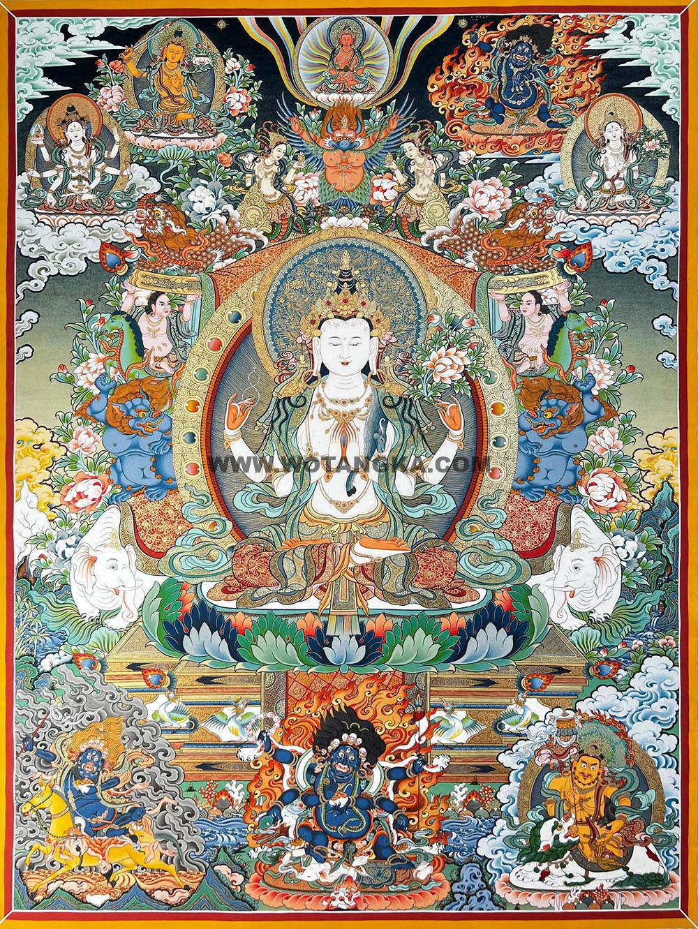 编号188-103220:彩绘唐卡-四臂观音·三怙主(120*90CM左右) | 沃唐卡www.WoTangKa.com